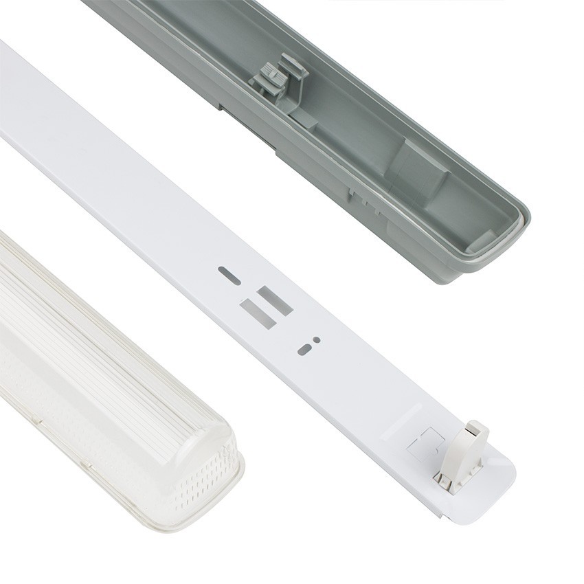 Armadura em policarbonato para instalação de tubos LED T8, proteção IP65 e várias medidas com clips Inox.