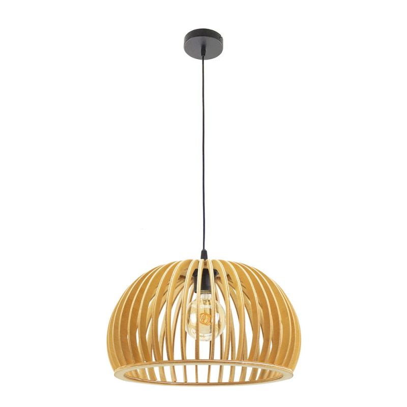 Candeeiro suspenso da série CAMBARA feito de madeira NATURAL. Consiste numa armação de ripas de madeira que formam um corpo esférico aberto. Ideal para quartos decorados no novo estilo vintage rústico ou minimalista. A sua estrutura permite a passagem da luz, criando uma atmosfera quente e acolhedora, também característica das zonas mediterrânicas dedicadas ao descanso e à meditação. Este estilo é também utilizado para áreas de trabalho e casas decoradas com tecidos e fibras naturais. É aconselhável completá-lo com uma bela lâmpada decorativa para preservar a sua estética. Tem um suporte para lâmpadas E27. Lâmpada não incluída. As suas dimensões, ajustáveis em altura, são 33<178x35x35x35 centimetros. Está disponível em vários modelos feitos de ripas de madeira, dando origem a diferentes formas e tamanhos. Este mesmo candeeiro suspenso está também disponível em madeira de cor castanha.