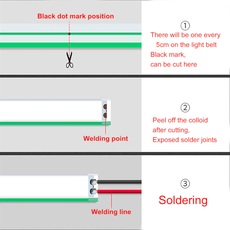 * O Neon LED pode ser cortado a cada 5 cm na área marcada com um ponto.