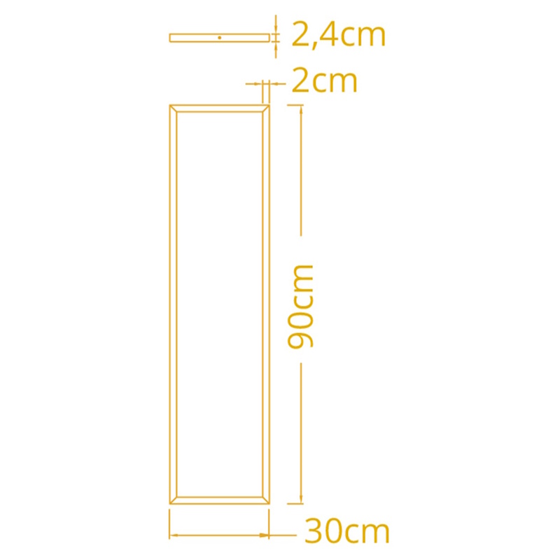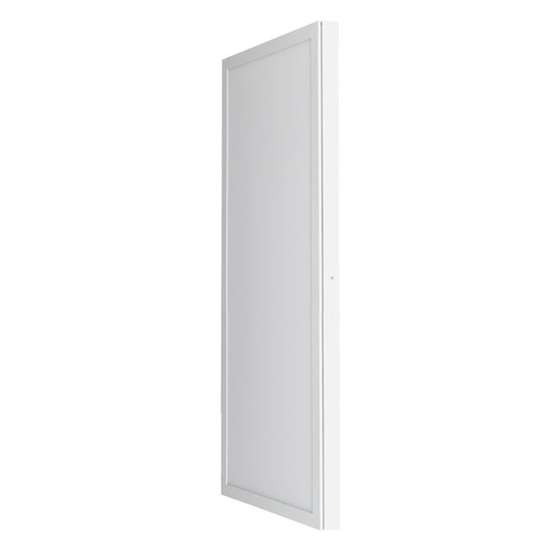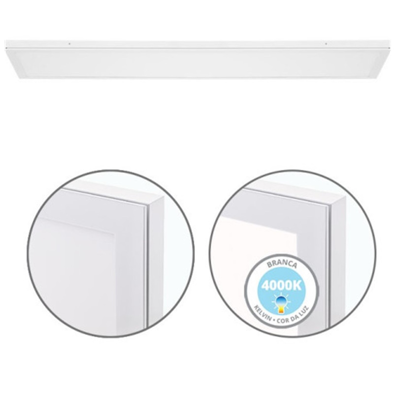 As medidas deste modelo de painel superfície são de 90 cm de comprimento, 30 cm de largura, 2,3 cm de altura, em branco. Conta com uma luminosidade de até 7.200 Lúmens. Este modelo contém 1 módulo LED de 72W. Dispõe de um grau de abertura de 120°.