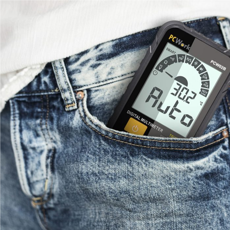 Este é multímetro é perfeito para amadores, estudantes e profissionais. Devido ao seu design inovador e compacto, assemelha-se a um smartphone moderno. Com uma função de seleção de faixa de medição inteligente, ele protege o usuário ao garantir que a faixa de medição correta seja escolhida. O multímetro vem com uma carcaça de borracha robusta, uma luz de trabalho e possui uma função de detecção de tensão sem contato, bem como cabos de teste de alta qualidade.