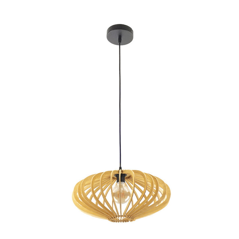 Candeeiro suspenso da série SAPELLI feito de Madeira de cor natural. Consiste numa armação de ripas de madeira que formam um corpo que lembra uma lanterna japonesa. Ideal para quartos decorados no novo estilo vintage rústico ou minimalista. A sua estrutura permite a passagem da luz, criando uma atmosfera quente e acolhedora, também característica das zonas mediterrânicas dedicadas ao descanso e à meditação. Este estilo é também utilizado para áreas de trabalho e casas decoradas com tecidos e fibras naturais. É aconselhável completá-lo com uma bela lâmpada decorativa. Tem um suporte para lâmpadas E27. Lâmpada não incluída. As suas dimensões, ajustáveis em altura, são 31<171x35x35x35 centimetros. Está disponível em vários modelos feitos de ripas de madeira, dando origem a diferentes formas e tamanhos. Este candeeiro também pode ser encontrado em madeira de cor castanho.